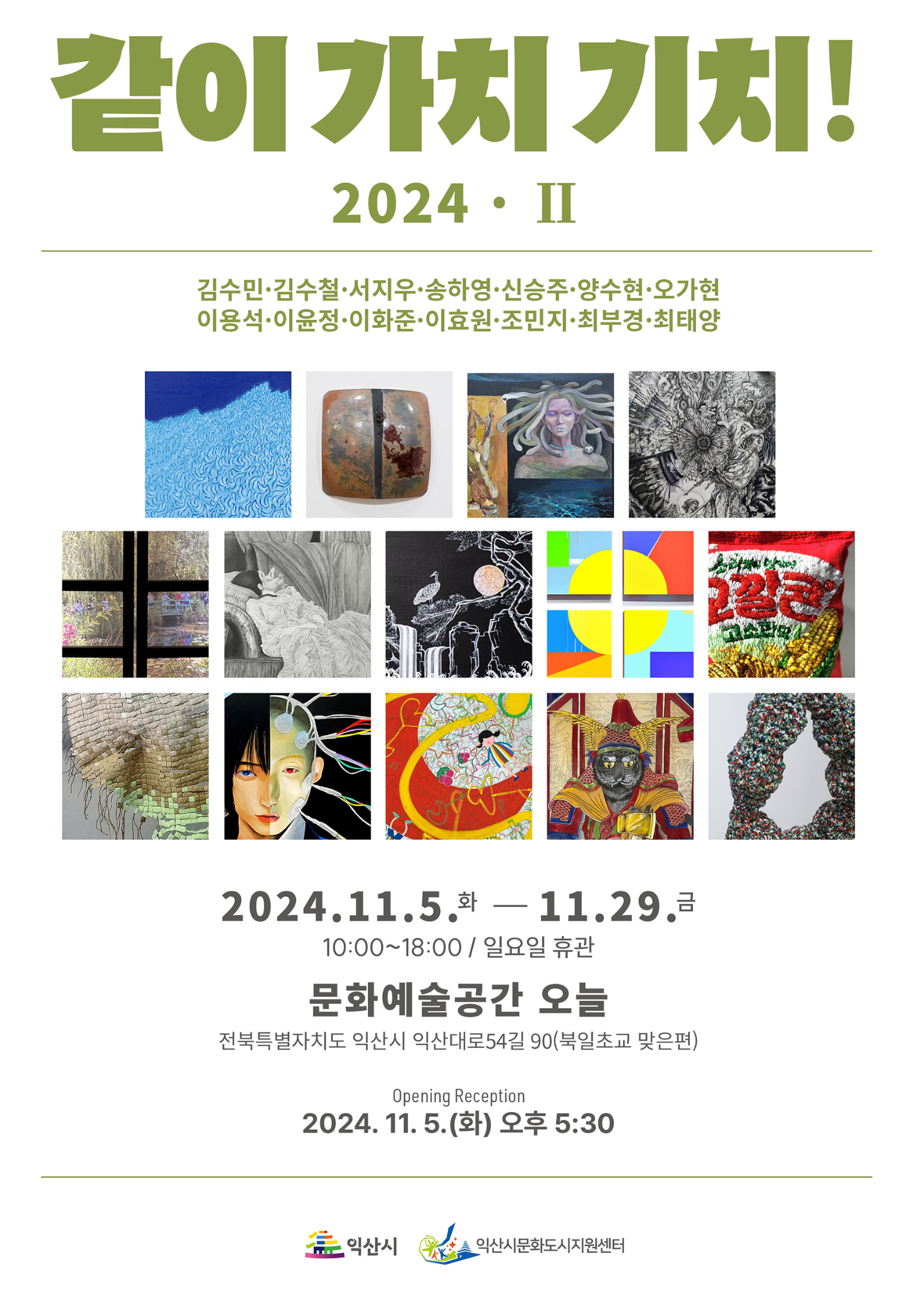 이러한 시공간에 서서, 원광대학교 미술전공자들은 영속적 삶의 가치와 기치를 올리고자 2023년에 1부와 2부로 <같이 가치 기치!> 전시 시리즈를 시작했고, 이어서 올해 2024년 6월에 1부, 그리고 이제 11월에 2부 전시를 올리며 그 뜻을 새기고자 합니다. 경주인양 달려가는 일상에 잠시 쉼을 허락하시고, 오셔서 느림의 미학을 즐기시기 바랍니다.